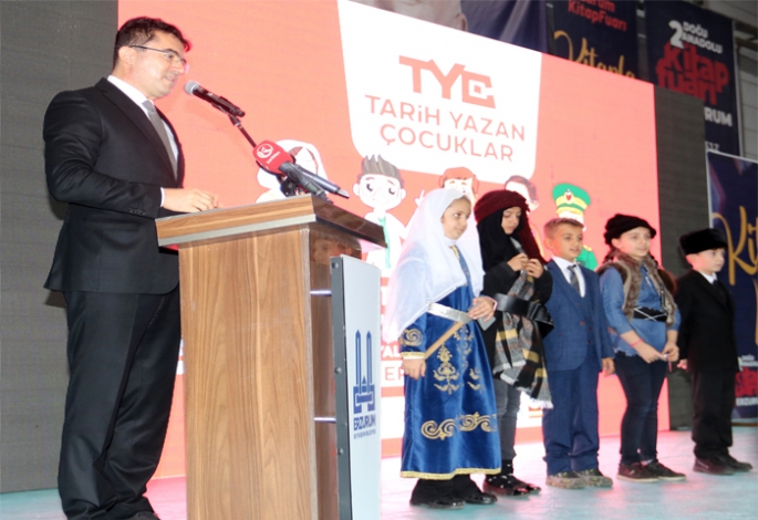 Erzurum Büyükşehir Belediyesi’nin en önemli sosyal sorumluluk projelerinden biri olan ‘Tarih Yazan Çocuklar Projesi’, Erzurum’da ‘100 günde yeni bir nesil doğuyor’ sloganı ile muhteşem bir lansman yaptı. Recep Tayyip Erdoğan Fuar Merkezi’nde gerçekleştirilen programa ilkokul çocukları, Türk Büyüklerini temsilen sahneye çıktı. Çocuklar Türkçe ve İngilizce canlandırdıkları kahramanların hayatlarını anlattı. Çocuklara Türk kahramanlarını tanıtmak için hazırlanan Tarih Yazan Çocuklar Projesi’nin lansmanı yoğun ilgi gördü. Recep Tayyip Erdoğan Fuar Merkezi’nde gerçekleştirilen lansmanın mottosu ‘100 günde yeni bir nesil doğuyor’ oldu. Programa kent protokolü, yazarlar ve çocuklar katıldı. Açılış töreninde konuşan Erzurum Büyükşehir Belediye Başkanı Mehmet Sekmen, Tarih Yazan Çocuklar projesinin hayati bir çalışma olduğunu söyledi. Başkan Sekmen, “Bilindiği gibi hayırsever insanların desteğiyle de devam eden projemiz kapsamında bütün ilköğretim okullarında kitaplıklarımızı kurduk. 7 Kasım’da kitap okumalarımız başlayacak. 23 Nisan Ulusal Egemenlik ve Çocuk Bayramı’mızda tüm kitap okumalarımız da tamamlanmış olacak” dedi.