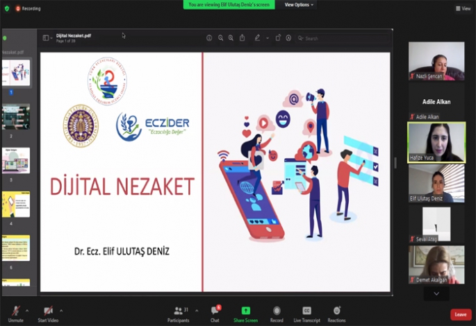 Çalıştayın Düzenleme Kurulu Eş Başkanlığını yapan Eczacılık Fakültesi öğretim üyelerinden Dr. Öğr. Üyesi Elif Ulutaş Deniz ise Dijital Nezaket konulu sunumunda dijital ayak izi, dijital itibar ve nezaketin sosyal medyada nasıl olması gerektiğini belirterek tüm dünyada internet teknoloji oranına, dijital ayak izine ve yeni medyanın olumlu olumsuz etkisine değinerek, ticari markalama ve siber zorbalığa, nezaket, görgü kurallarına ve bunların önemine, sosyal medyada kaçınması gereken davranışlara, farklı platformların kendine özgü duruşlarına vurgu yaparak medya okuryazarlarının artması gerektiğini ifade etti.