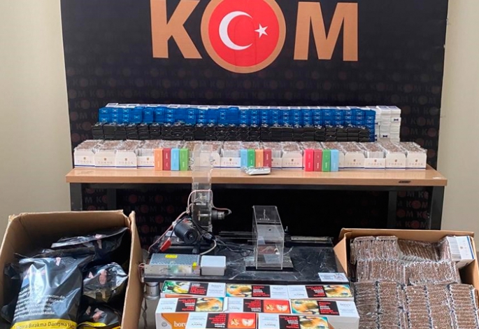 Edinilen bilgiye göre, İl genelinde 5607 sayılı Kaçakçılıkla Mücadele Kanunu kapsamında KOM Şube Müdürlüğümüzce yapılan çalışmalarda; şüpheli şahıs E.T’nin iş adresi ve ikamet adresinde yapılan aramada; 725 paket kaçak sigara, 20 bin 440 adet içi dolu makaron, 15 adet elektronik sigara likiti, 12 paket (her biri 1 Kg) tütün, 1 adet elektronik sigara, 23 bin 800 adet boş makaron ve 1 adet sigara sarma makinesi ele geçirildi.