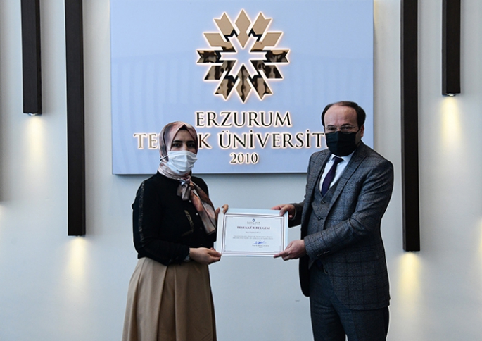Erzurum Teknik Üniversitesi (ETÜ) Rektörü Prof. Dr. Bülent Çakmak, görevde 5 yılını dolduran idari personele teşekkür belgesi verdi.