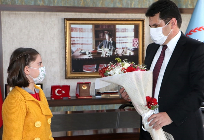 Milli Eğitim Müdürlüğü'nde düzenlenen törende kendisini ziyaret eden Celal Akın İlkokulu 4. sınıf öğrencisi İdil Duru Kalçık'ı makamında ağırlayan milli Eğitim Müdürü Salih Kaygusuz, Kalçık'a tablet hediye etti.