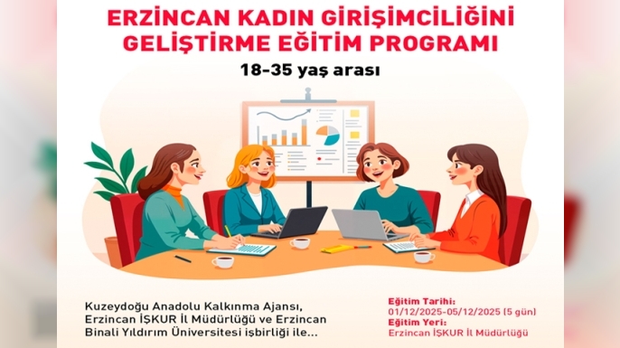 Kuzeydoğu Anadolu Kalkınma Ajansı (KUDAKA), Erzincan İŞKUR İl Müdürlüğü ve Erzincan Binali Yıldırım Üniversitesi iş birliğinde, 18-35 yaş arası kendi işini kurmayı düşünen veya iş arayan kadınlara yönelik ücretsiz sertifikalı eğitim programı düzenlenecek.