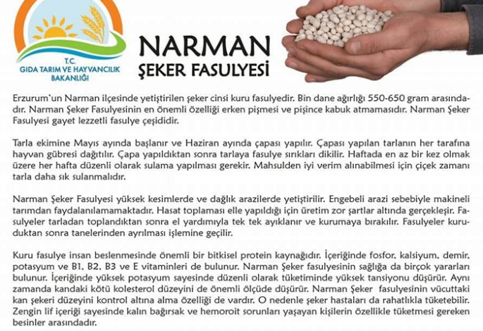 Narman İlçe eski Tarım Müdürü Erzurum İl Tarım ve Orman Müdür Yardımcısı Erhan Çiftgül, “Narman İlçe Müdürü olduğumuz 2018 Yılında Milletvekilimiz Orhan Deligöz ile adını koyduğumuz, İlçe Müdürlüğümüz alçak gönüllü ve çalışkan mühendisleri mevcut İlçe müdürümüz Yakup Nuri Ustaoğlu, Erdal Bozbayır İsmail Vural Musa Şimşek ve Neşe Bozkan ile altyapı çalışmasına başladığımız Narman Şeker Fasulyemize, Türk Patent Enstitüsü tarafından Coğrafi İşaret Tescil Belgesi verildi.