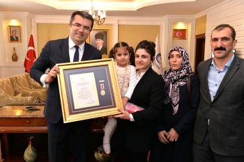 Tören öncesinde makamında şehit ailelerini ağırlayan Vali Okay Memiş, Piyade Teğmen Ahmet Aktepe’nin 4 yaşındaki kızı Aysima Aktepe ile yakından ilgilendi.