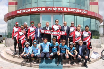 Ekolojik Yaşam Bisiklet Derneği üyeleri Erzurum’dan Tercan’a hareketinden önce Gençlik ve Spor İl Müdürü Fuat Taşkesenligil’e Samsunspor atkısı hediye ederken, Taşkesenligil de, konuklara çeşitli hediyeler verdi.