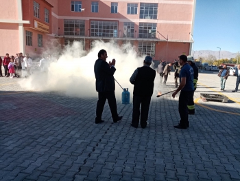 Tatbikatta yangın tüpü kullanılması ve yangının nasıl söndürüldüğü ve alev almış bir tüpün ıslak battaniye ile nasıl söndürüldüğü öğrencilere uygulamalı olarak gösterildi.