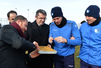 Erzurum Valisi Okay Memiş, Süper Lig’e çıkma mücadelesi veren ve Türkiye Ziraat Kupası’nda yoluna emin adımlarla devam eden Süper Toto 1. Lig ekiplerinden B. Belediye Erzurumspor’un yönetici ve futbolcularını tesislerde ziyaret ederek elleriyle tatlı ikram etti.