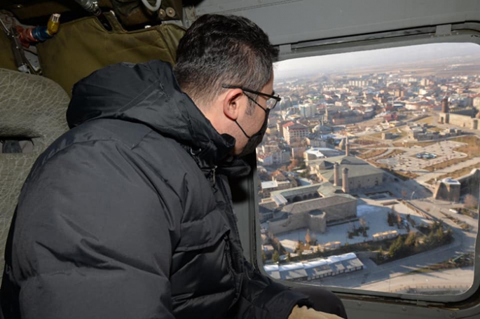 Erzurum Valisi Okay Memiş, yeni tip koronavirüs (Kovid-19) salgınıyla mücadele kapsamında getirilen sokağa çıkma kısıtlamasıyla ilgili helikopterle şehir denetimi yaptı.